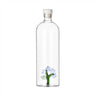 Bottiglia in vetro borosilicato, caratterizzata da i fiori azzurri che contraddistinguono ogni complemento della collezione Botanica.
