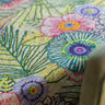 Il fondo neutro mette in risalto la vivace fantasia floreale, caratterizzata da grandi fiori stilizzati e foglie sottili intrecciate in un raffinato gioco di colori – turchese, lilla, rosa, verde brillante e delicati tocchi di giallo. Il disegno, ricco ma armonioso, dona movimento e luminosità, creando un effetto moderno e di grande personalità.