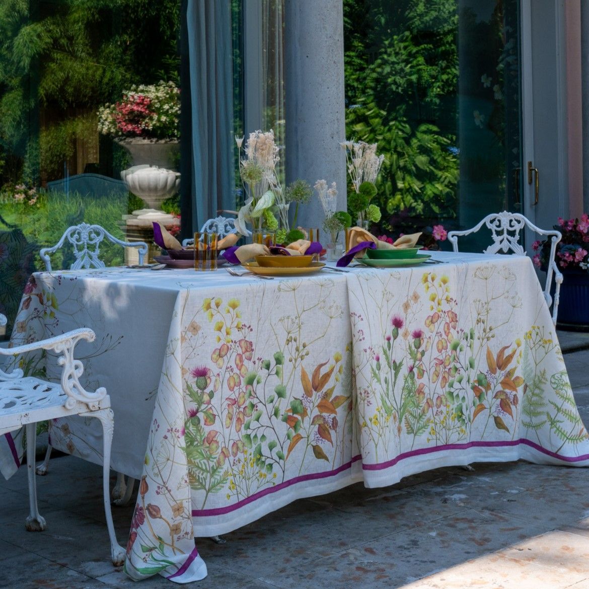Elegante e naturale, presenta un delicato motivo botanico su fondo chiaro, con fiori di campo nelle tonalità del rosa, verde e ocra, rifinita da un sottile bordo color lampone.